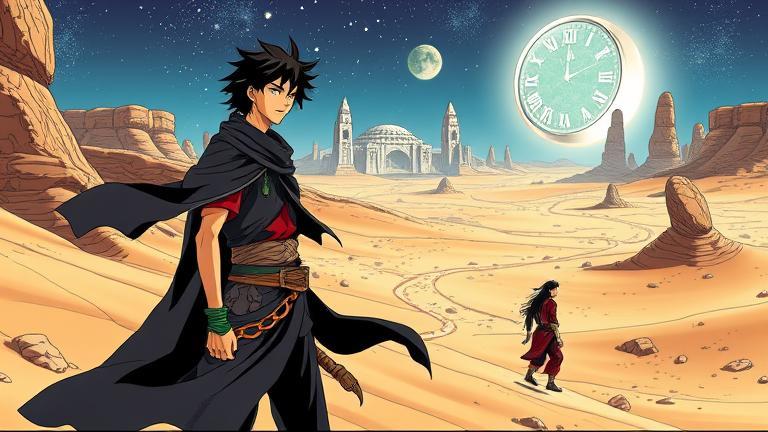 In a realm where sand whispered secrets and the sky burned like molten gold, Jotaro Kujo stood amidst the horizon. ‘Time is a strange thing here,’ he murmured, adjusting his hat against the relentless sun. The air shimmered as shadows danced upon the dunes. Unsure of his purpose, he gazed into the distance where the sun kissed the land. Suddenly, a voice echoed, ‘You seek the Timekeeper, do you not?’ Jotaro turned, spotting a figure wrapped in robes like rolling clouds. ‘Join me, if you wish to reclaim what was stolen.’ The Timekeeper extended a hand, but Jotaro hesitated. ‘I don’t need your help,’ he replied defiantly. Yet something within him stirred, compelling his feet to follow. As they ventured deeper into the desert’s embrace, surreal landscapes multi-faced Jotaro’s soul. Memories of battles and triumphs flickered before him. He stood before towering dunes, each representing a leg of his journey. Hours felt like years as the sun changed its hue from blazing yellow to a painful crimson. ‘You must confront your past to reclaim the future,’ the Timekeeper suddenly stated ominously. ‘I’ve already faced my past,’ Jotaro insisted sternly. ‘And I emerged victorious.’ But doubt gnawed at him like parasitic whispers. They reached an oasis shimmering with untold secrets. ‘Here lies a fragment of your past,’ the Timekeeper revealed. As Jotaro closed his eyes, visions swirled around him. Faces of friends long gone, enemies fallen, and moments he wished to erase coalesced into a pulsating mass. ‘Is this what you seek?’ the Timekeeper challenged. ‘You’ve forgotten the impact of your choices.’ Clenching his fists, Jotaro stepped forward. ‘I won’t let my past dictate my future!’ With each heartbeat, he felt the weight of time pressing upon him. ‘To defeat the one who controls time, you must embrace every error, each painful lesson,’ advised the enigmatic Timekeeper. Out of the motion of time, an adversary emerged, a figure shrouded in an aura of clock gears and endless rotations. ‘You’ve wandered into my domain, Jotaro Kujo,’ the villain sneered. ‘Time is my ally.’ Undeterred, Jotaro smirked, ‘And I have a Stand—Time won’t bend to your will!’ As the sun stooped lower, a battle of wills ignited. With every punch, the air crackled with energy, unraveling moments that were never meant to be altered. ‘Star Platinum, The World!’ Jotaro shouted. Time froze momentarily, allowing Jotaro to strike. Yet with each blow, memories surged, pushing him to relive the pain he’d ignored. ‘Why do you hesitate?’ the Timekeeper prodded from afar. ‘By embracing your scars, you gain the strength to change.’ Invigorated by newfound resolve, Jotaro steadied himself. ‘No more running!’ His punches linked time itself to his will, unraveling the villain’s grasp. A final clash erupted, transcending physicality, focusing on the spirit’s essence. In that instant—’I am not just my past,’ he declared,-the sands parted as bolts of light reprimanded darkness. When silence reigned again, the swirling past dissolved into a radiant future. ‘You’ve learned well,’ the Timekeeper responded, a hint of pride sparking in his ancient eyes. With the realm of sand restored, Jotaro turned. ‘Thank you, but I won’t forget my journey.’ The Timekeeper nodded, disappearing into the sun’s warm embrace.