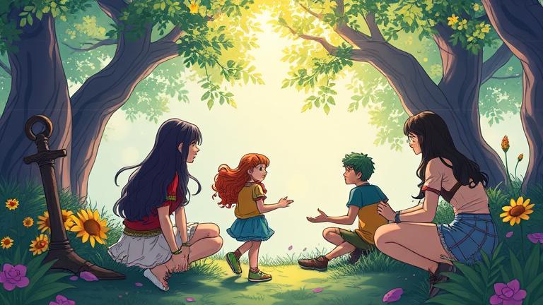 As they returned to the edge of the grove, they paused, glancing back at the magic they had uncovered. Emma smiled softly, ‘Today has transformed us; we are never just friends—we are family.’