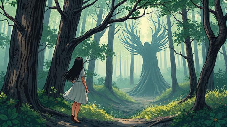 ‘If only these trees could talk,’ she murmured, her eyes scanning the twisted branches. Little did she know that she wasn’t alone. ‘Perhaps they once did,’ came a soft, ethereal voice from behind her.