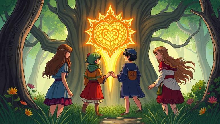 ‘Will you tell us a story?’ Emily asked, her voice tremulous with hope and need. The bard tilted his head and began reminiscing. ‘Once, there were five hearts entwined, facing sundry trials and meeting forgotten spirits. Each challenge sprung from the sorrow of the world—only through expression did the light remain bright.’ His words sparked a flash of realization among the friends. Through every transformation, the key to unlocking the magic of their friendship was open dialogue.