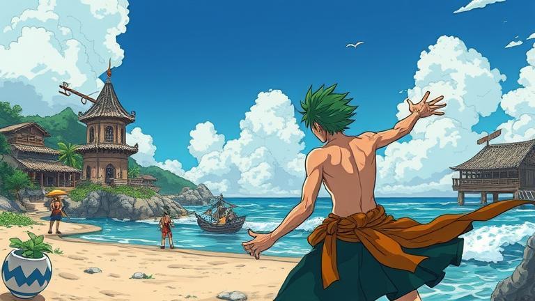 As the waves crashed against the shore of the village, Zoro turned to his friends, intrigued by what lies ahead, emboldened to face whatever challenge awaited, together.
