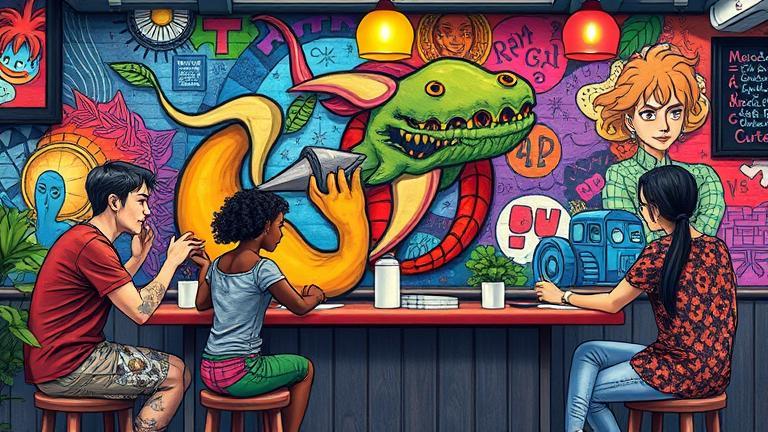 ‘To the collective journey ahead!’ Theo proclaimed, as they all erupted in laughter and festive joy. The colorful mural slowly coalesced into the heart of the café—a lasting emblem combing their dreams together.