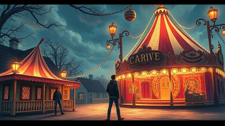 On a crisp autumn night, Amelia and Lucas stumbled upon a flickering light in the distance, while walking back home. Curiosity sparked, they decided to investigate. As they approached, they found themselves standing at the entrance of a colorful carnival adorned with vibrant banners and twinkling lights. A sign read: ‘The Enchanted Carnival – Enter if you dare!’