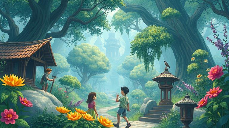 ‘We’ll need to find three magical items hidden within the garden,’ Lila instructed. ‘A golden leaf, a crystal droplet, and a shining stone. Each will help to reveal the light!’
