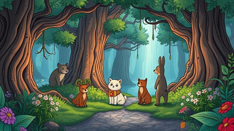 After a few steps, they found themselves in an enchanting grove where sunlight filtered through the canopy like liquid gold, illuminating a circle of magnificent flowers. Suddenly, a voice called out from a nearby thicket, ‘Welcome, brave souls!’ The group jumped back, eyes wide. A fox with a sleek coat and wise eyes emerged. ‘I am Felix, guardian of this grove. You have entered a realm of wonder, but only those pure of heart can cross the vines beyond.’
