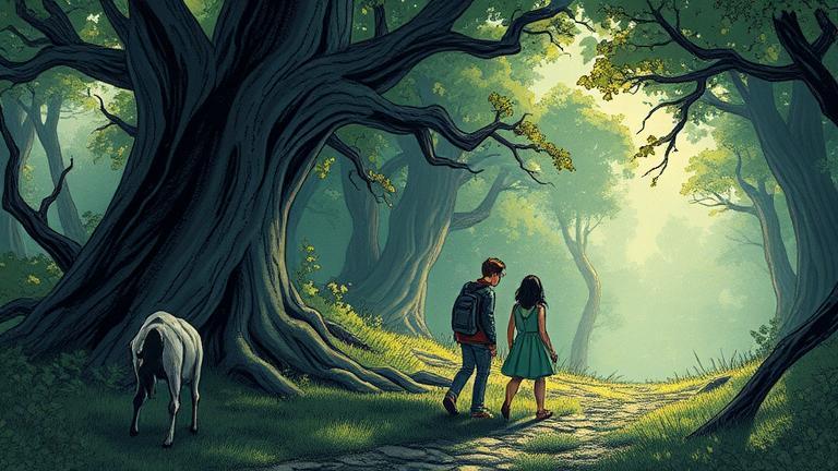 Beneath a canopy of vibrant green leaves, four friends—Lucas, Mia, Jonah, and Leah—ventured deeper into the woods, laughter echoing off the ancient trees. ‘Are we sure this is the right path?’ Mia asked, brushing her hair out of her eyes. ‘We’ve been walking for hours!’ ‘Just a little further,’ Lucas replied, peering at an old map. ‘It should be just beyond this ridge.’