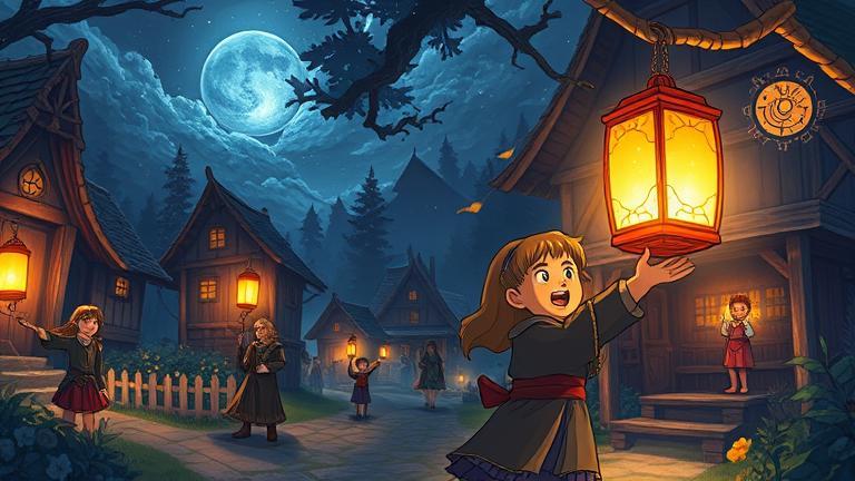 One evening by a flickering fire, the villagers spoke of dreams under the starlit sky. ‘What if we combine our stories and harmonize our dreams?’ Rowan suggested eagerly. ‘Each tale will join our strength and renew our light.’ They practiced around the fire, their voices rising like flames in unison. Unbeknownst to them, the essence of each shared moment danced through the air, reaching for the lantern.