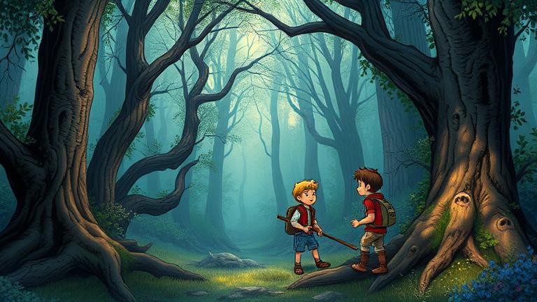 In the heart of the Whispering Woods, two friends, Elara and Finn, found themselves standing before the ancient oak known as Eldergrove. Its gnarled branches stretched into the sky, whispering secrets of old, as rays of sunlight filtered through the thick canopy. ‘Do you really think the legends are true?’ Elara asked, her green eyes flickering with curiosity. Finn shrugged, his messy brown hair falling into his eyes. ‘Only one way to find out,’ he replied, advancing towards the tree. As they approached, a figure emerged from behind the trunk. It was Lyra, a forest spirit with silver hair and wings that shimmered like dewdrops in the morning light. ‘You seek the truth, young ones,’ she said, her voice like the rustling leaves. ‘But are you prepared for what you might find?’ Finn nodded eagerly, while Elara hesitated, sensing the weight of Lyra’s words. ‘What do we need to do?’ Elara queried. Lyra smiled mysteriously. ‘Follow the path of the fireflies under the moonlight. They will guide you to your destiny.’ With newfound determination, Elara and Finn clasped each other’s hands and ventured deeper into the woods. As dusk fell, the fireflies lit their way, twinkling like scattered stars. Suddenly, they heard a low growl behind them. Out of the shadows stepped a large wolf with shining silver fur, its eyes glowing like emeralds. Finn took a step back, but Elara stood firm. ‘We mean no harm,’ she declared, trying to sound brave. The wolf sniffed the air, then spoke in a rich, deep voice. ‘Are you explorers or trespassers?’ Finn stammered, ‘Explorers!’ The wolf nodded, seemingly satisfied. ‘Then you must prove your bravery. Follow me.’ Hesitantly, they followed the beast until they arrived at a hidden clearing with an ancient stone altar at its center. ‘What now?’ Finn asked nervously. ‘You must each place a part of yourselves on the altar,’ the wolf instructed. Reluctantly, Elara removed a piece of her necklace, and Finn unfastened a button from his shirt. When they placed these items on the stone, it began to glow. ‘The forest recognizes you,’ said the wolf. ‘But with that comes a choice.’ A shimmering portal opened where the altar stood. ‘Step through, and you will face the greatest fear of your hearts. But if you succeed, you will bond with the magic of the forest.’ Elara and Finn exchanged glances, their trepidation replaced by excitement. ‘Together?’ she asked. Finn smiled, ‘Always together.’ They stepped forward, hand in hand, and felt a pull as the world swirled into a blur. Suddenly, they found themselves on a steep mountain, fog swirling around them like tendrils of doubt. ‘What is our greatest fear?’ Elara wondered aloud. ‘I know mine,’ Finn replied, looking down the cliff. ‘I fear failing those I care for.’ A shadow danced before them, projecting images of their past mistakes, echoing with their insecurities. ‘You have to confront it!’ Elara urged as the shadows pressed around them. ‘Together, we can push through!’ Drawing upon their shared strength, they faced their fears together. Slowly, the shadows began to dissipate as they whispered affirmations of support, their bond empowering them. Finally, the mountain crumbled away, revealing a vibrant meadow. ‘We did it!’ Elara exclaimed joyfully, but their victory was short-lived as they sensed the forest was in peril. A dark figure loomed in the distance, threatening the peace of the woods. ‘We can save it,’ Finn said, and Elara nodded determinedly. Striding forward, they knew that together, they possessed the strength of the forest itself.