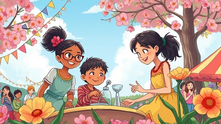 Lila noticed the blooming flower crowns that adorned every child’s head and broken into a heartfelt smile. ‘I love how everyone has brought something special to share—what a sight!’ she exclaimed, her eyes sparkling.