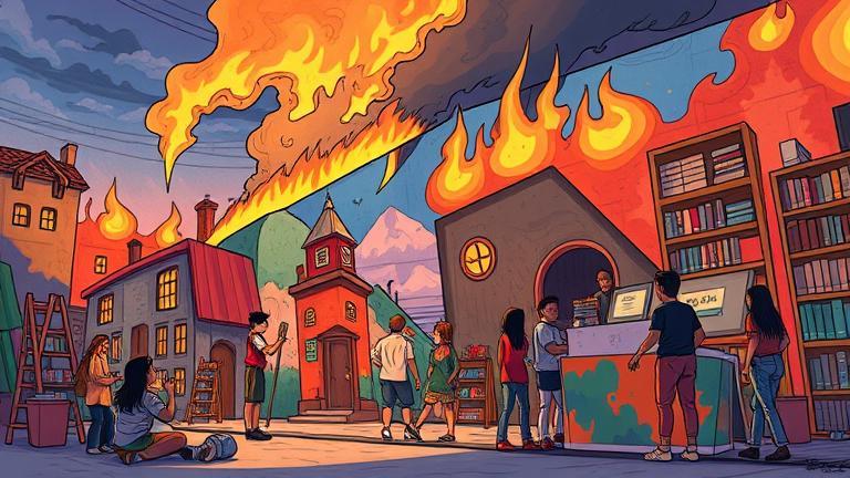 In the distance, the flames danced brighter, ferociously licking at the old library’s wooden structure. Tears blurred Emily’s eyes as she envisioned the murals inside, depicting not just stories, but the dreams of generations. ‘We can’t let it burn!’, she cried out, almost pleading.