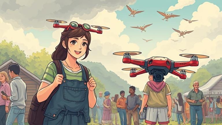 Young and old alike chimed in, merging past with present, laughter with memories. Inspired, Lily’s older brother, Ben, partnered up with his best friend. ‘Let’s act out our stories with the drones!’ he urged. They dove into playful improvisation, and before long, laughter erupted like jubilant fireworks in the damp air.