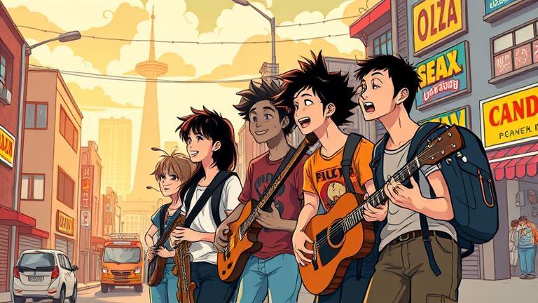 As the friends buzzed with excitement on their post-jam adventure, they wound their way through the lively city streets. With each step, Zoe, invigorated and intuitive, declared, “Can you feel that? The city pulses with energy!” Max, always keen to lift spirits, strummed his guitar, crafting melodies that danced into the night air, gathering curious onlookers. “Let’s play! Maybe a crowd will follow!” he suggested enthusiastically. It wasn’t long before the joyous chords brought a merry crowd closer.