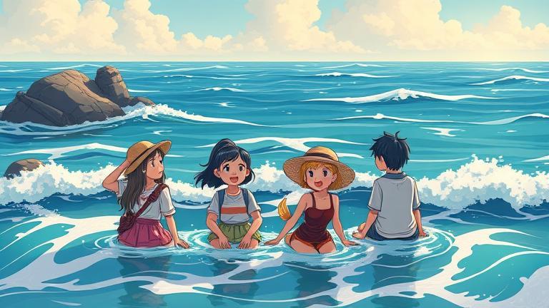 As the sun dipped below the horizon, casting hues of amber across the waves, Nora, Ethan, Mia, and Jake stood together on the sandy shore. The salt of the ocean clung to their skin, remnants of their earlier splashes and laughter. ‘Can you believe how deep we swam?’ Mia exclaimed, her eyes sparkling. ‘I swear, I saw an octopus!’ Ethan chuckled, ruffling Mia’s hair, ‘More like a slippery sea cucumber. The depth wasn’t that impressive!’ Jake, always the mediator, interjected, ‘It’s all magical underwater. Let’s just agree it was a blast!’