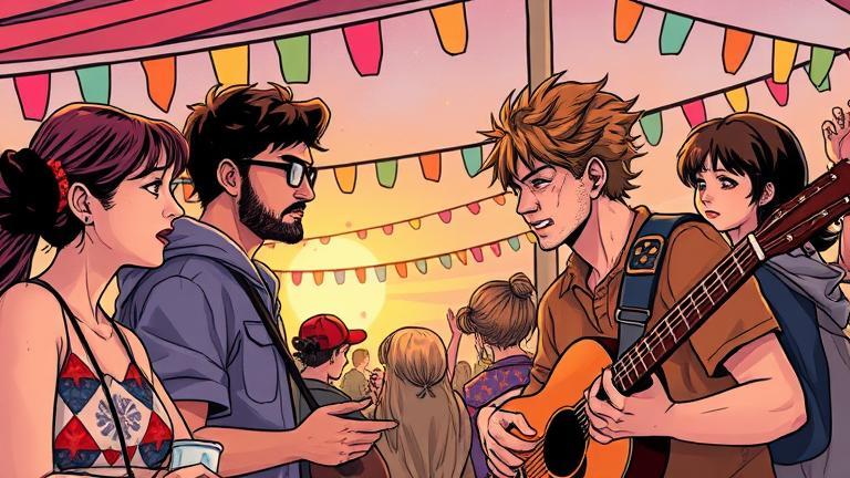Encouraged by Mia and Priya, he began belting out improvised lyrics that celebrated the night, eliciting cheers that filled their atmosphere. Each strum of his guitar rang true, creating an infectious rhythm.