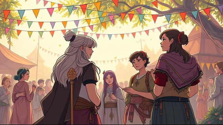 Upon entering the celebratory gathering, vibrant banners fluttered in the winds, while the aroma of spiced bread and stews wafted through the air. Laughter erupted from children chased by excited puppies, and elders shared tales of old. But amidst this sea of joy, murmurs from families hinted at hidden struggles—stories trapped in shadows longing to emerge. ‘We need to find those moments,’ Lyra whispered to her friends. ‘The hidden voices,’ Rowan added, urging them forward into the throng.