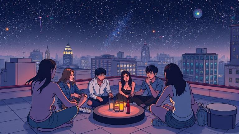 The air was thick with excitement as the twilight deepened, shrouding the rooftop in a blanket of stars. Max strummed his guitar, a mixture of mellow chords floating in the calm night. ‘This one’s for all of us!’ he declared, his blue eyes sparkling with enthusiasm.
