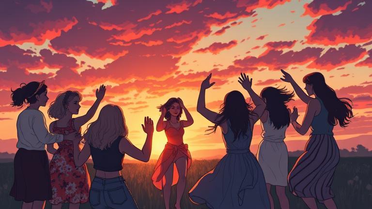 As the warmth of dawn enveloped the group, Kira stood at the heart of the circle, emotion shimmering in her gaze. ‘Each sunrise holds the promise of new beginnings,’ she spoke, raising her arms toward the pastel sky. Amara twirled gracefully, her flowing silks billowing like petals caught in the wind. ‘Let us dance not just for ourselves, but for those we’ve lost and those we hold dear!’ Her voice rang clear and strong, igniting a spark of unity.