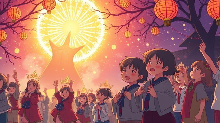 As the vibrant festival continued, Chase spotted a small girl, Lily, hiding under a table, her eyes wide with fear. ‘Hey there!’ he said gently, kneeling beside her. ‘It’s alright; the shadow is gone now. Come join us!’ The girl shook her head, tears brimming. ‘But what if it comes back?’ Zoro crouched down next to him. ‘If it does, we’ll be ready! We’ll protect you and everyone here!’ Nami chimed in, ‘You see those sky lanterns? Every one of them represents a hope. Let’s light them together!’ Inspired, children began gathering lanterns all around, while Robin helped fashion one adorned with colorful flowers, symbolizing renewal. Jin challenged the crowd, ‘For every laugh we share, we’ll create a thousand more hopes!’ As laughter erupted around them, the atmosphere felt like a warm embrace against the night.