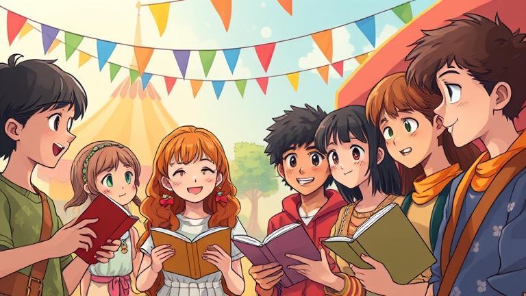 As the festival illuminated the twilight, Clara felt a surge of inspiration coursing through her veins. The sparkle in Felix’s eyes mirrored her own as they gathered together. ‘We need to invite the unexpected to our story,’ she suggested, a daring gleam in her eye. Amina nodded enthusiastically. ‘Maybe we face a rival storyteller who tries to steal our ideas!’ Their new companion, the rough-looking man, chimed in with a hearty laugh. ‘And I could be the one who noodles my way out of trickery! Always blurring lines between truth and fun!’ Jonah raised an eyebrow, intrigued. ‘But what if we also learned something from our rival? Like teamwork under pressure or how to confront jealousy?’ ‘This is actually getting really interesting!’ Felix exclaimed, his energy contagious. The group renewed their efforts to fill their canvas with colorful anecdotes entwined with deeper life lessons. As they directed their ideas, lanterns twinkled above like stars awakening alongside their creativity.