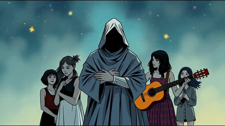 Sensing the sweetest harmony, Lila struck a soft chord, and the artists began to sway, encircling the cloaked figure in rhythmic motions. ‘Through dance and song, our spirits soar together. Share your heart!’ she encouraged, her fingers coaxing beauty from the strings of her guitar.