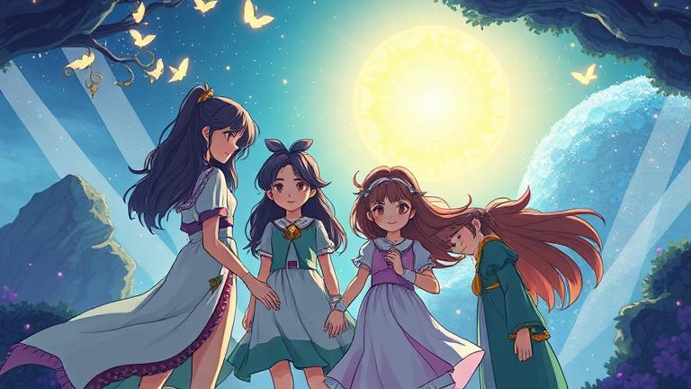 The echoes of the siblings’ collective resolve reverberated through the luminous branches of the newly transformed tree, enveloping them in its warmth. As they adjusted to their surroundings, the landscape before them unveiled a breathtaking panorama. Crystal tides sparkled beneath the golden sky, reflecting countless possibilities. *’Look how the waters shift!’*, exclaimed Eli, his eyes wide with wonder. *’They’re like mirrors reflecting our destinies!’* They felt drawn to the shores of this enchanted space, where light danced off the gentle waves, inviting them closer.
