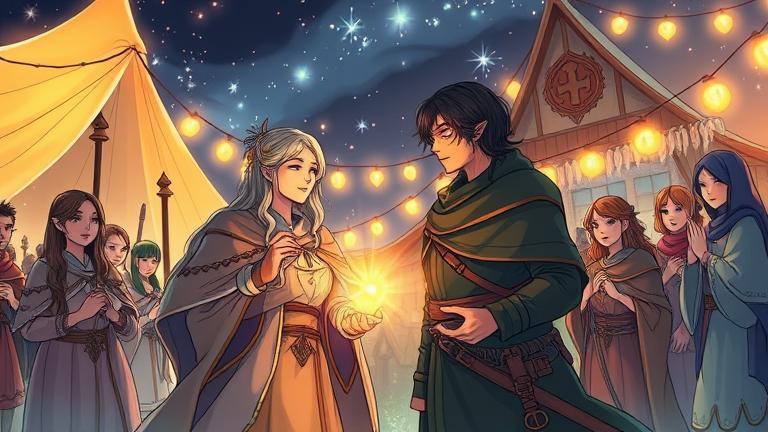 In the heart of the Festival of Light, colorful decorations swayed against the deepening twilight, yet an undercurrent of worry threatened to dampen their celebration. Elara, a fierce warrior adorned with tokens from her village, gathered the villagers after Melgar’s dire prophecy. ‘We can’t let fear infiltrate our hearts!’ she implored, her voice cracking the somber mood, ‘The festival is our time to stand together!’ Therin, her steadfast healer, nodded beside her. ‘Yes, Elara, but let’s infuse our approach with compassion. We strive not just for courage, but for hope.’ The villagers’ murmur subsided as they listened, the tension threaded with anticipation.