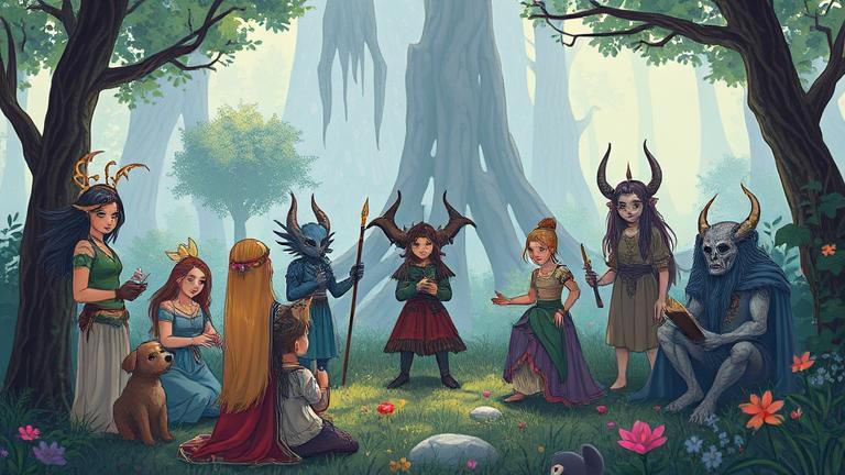 Returning to the glade, the enchantment continued. Jena proposed, ‘We must remember these moments. Let’s create a mural all together! An everlasting depiction of our shared tales!’ Enthusiasm surged through them as they marveled at the prospect. Koru leaped onto Elowen’s shoulder, chittering, ‘I’ll gather supplies to color our dreams!’
