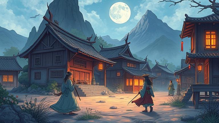 ‘I’ve traveled far,’ she said softly, ‘seeking help from this united village. The realms are bereft of harmony; darkness spreads like hatred above the land of spirits.’