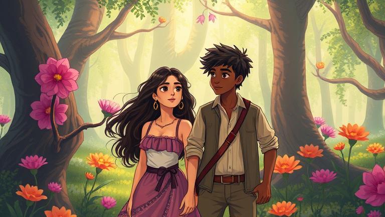 As Jena and Malik ventured deeper into the magical forest, the path beneath their feet became a tapestry of colors, each step vibrant with energy. ‘Look at how the flowers sway,’ Jena gasped, enchanted by their rhythm. ‘It’s as if they’re dance partners to the wind!’