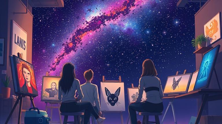 ‘We’ll not only share our art but also our dreams, expanding under this cosmic wonder!’ Mara nodded vigorously, ‘Agreed! As long as there’s a book tucked away for inspiration!’ With friendships renewed and creations blossoming, they embraced their artistic journeys amidst perspectives that sparkled like the stars overhead.