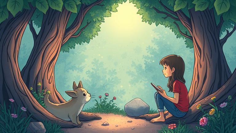 In a secluded part of Eldenwood Forest, Mira’s words faded into the gentle rustling of leaves. The warm sun filtered through the branches, casting dappled shadows on the ground. Her friend Leo, with his curious eyes, leaned closer, intrigued by her sentiment. ‘What do you mean, Mira? What stories are we holding onto?’ he asked. Mira smiled, running her fingers along the rough bark of an ancient tree before replying, ‘The stories of those who came before us, their triumphs and trials. Every tree here has witnessed something magical.’